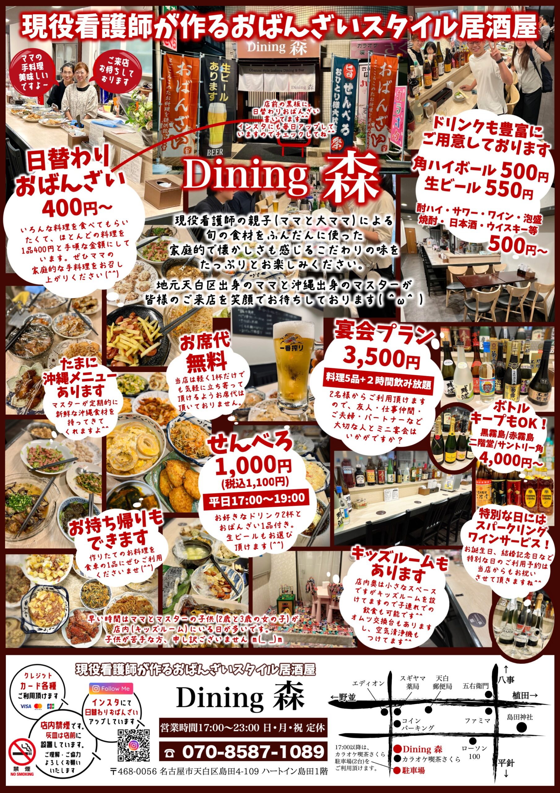 地元天白区在住、現役看護師の親子による旬の食材をふんだんに使ったおばんざいスタイル居酒屋です。